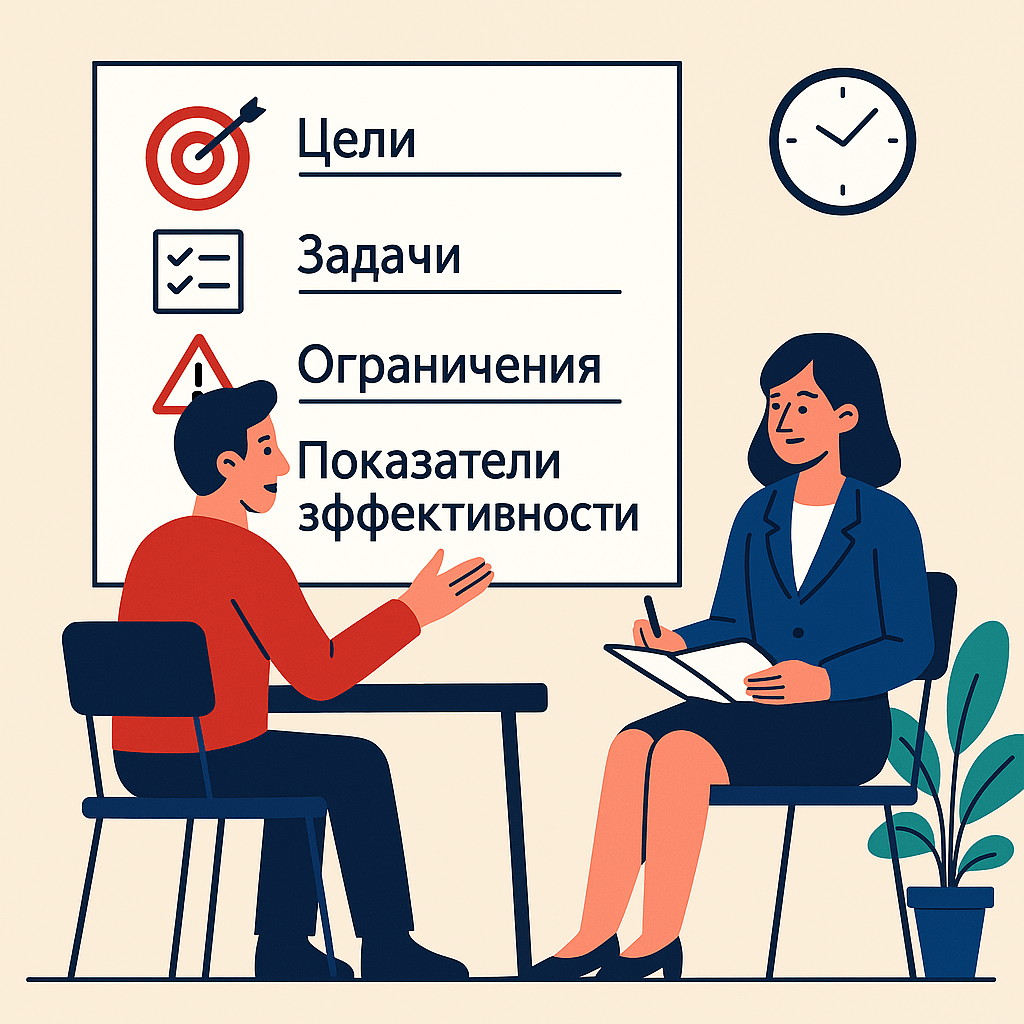 Проводим первую встречу или собираем вводные. Вы обозначаете цели, задачи, ограничения, показатели эффективности.